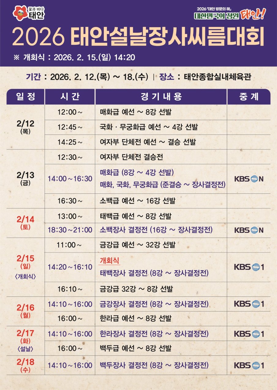 [Ytv영상스토리] 태안군이 민족 대명절 설을 맞아 2월 12일부터 18일까지 태안종합실내체육관에서 ‘위더스제약 2026 태안 설날장사 씨름대회 ’를 개최한다.