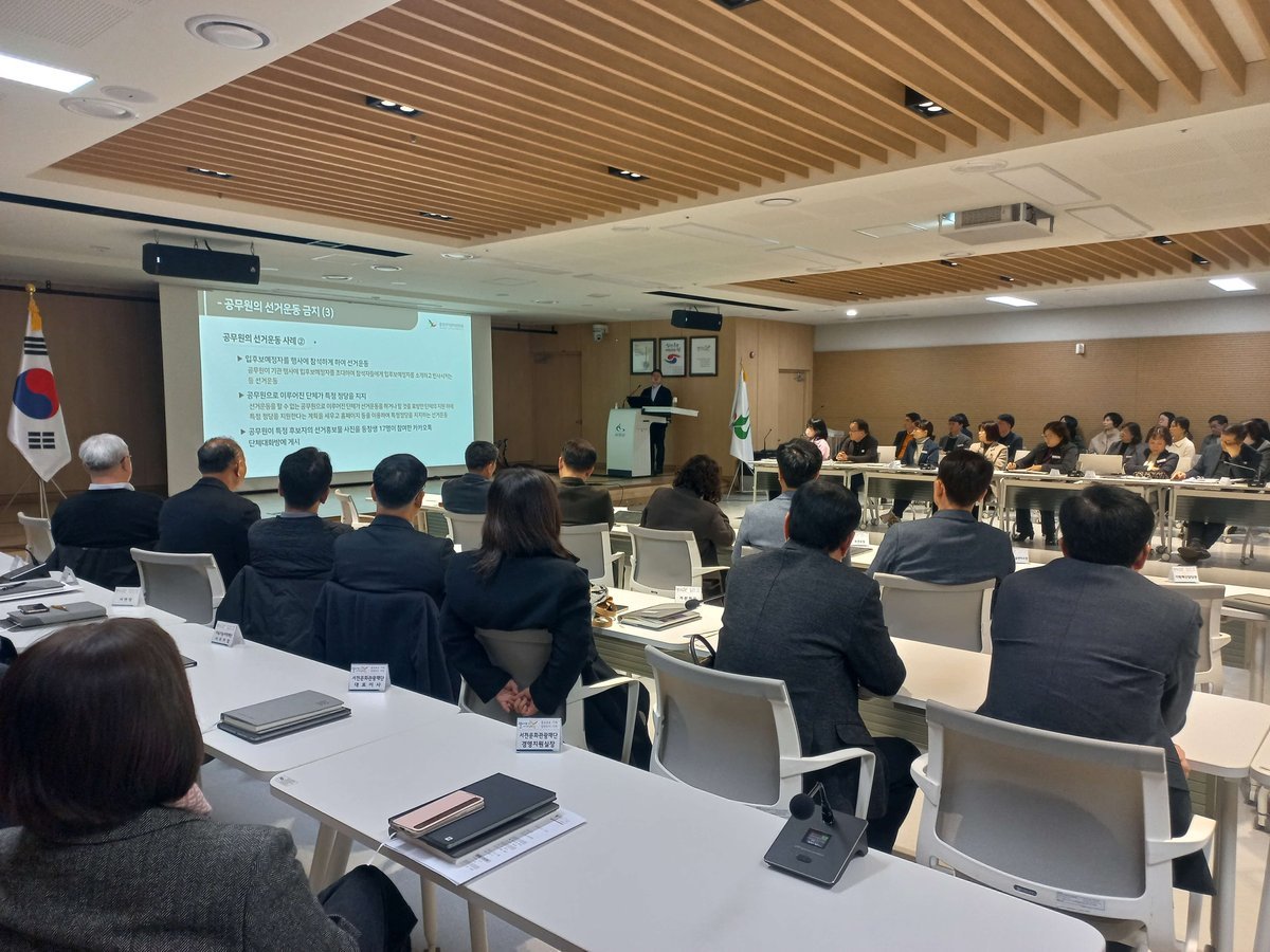 교육 내용은 ▶공무원의 선거 중립 의무 ▶「공직선거법」 및 「정치자금법」상 제한·금지 규정 ▶시기별 주요 제한·금지 사항 등으로 구성됐으며, 특히 실제 업무 과정에서 발생할 수 있는 사례 중심의 설명을 통해 공직자들의 이해도와 경각심을 높였다.