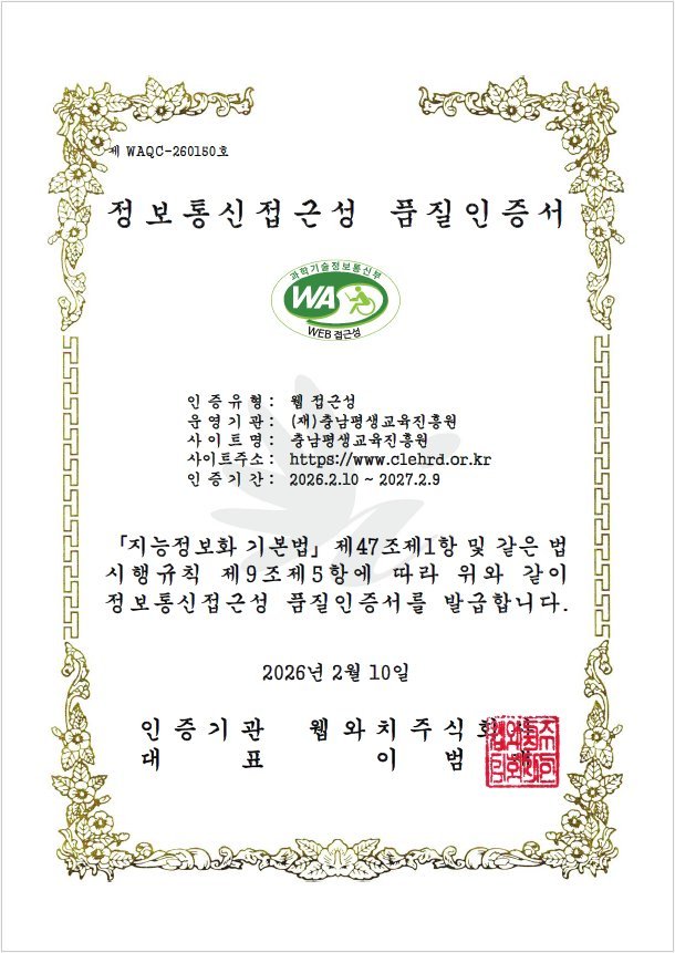충남평생교육진흥원 누리집 정보통신접근성 품질인증서