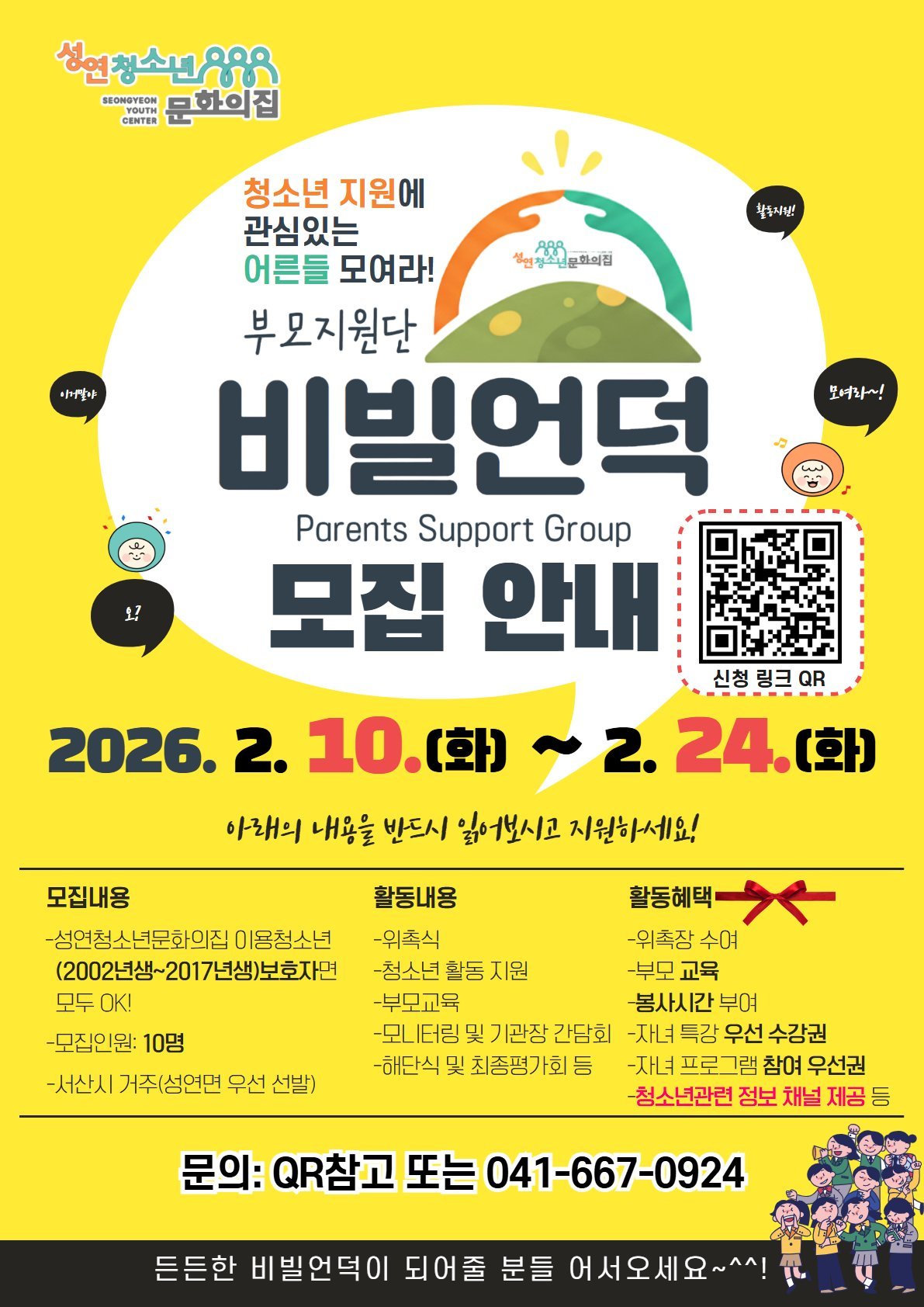 [Ytv영상스토리] 성연청소년문화의집은 2026년 한 해 동안 지역 청소년의 건강한 성장과 안정적인 발달을 지원하기 위해 청소년 보호자를 대상으로 부모지원단 '비빌언덕'참여자를 2월 10일부터 2월 24일까지 모집한다고 밝혔다.