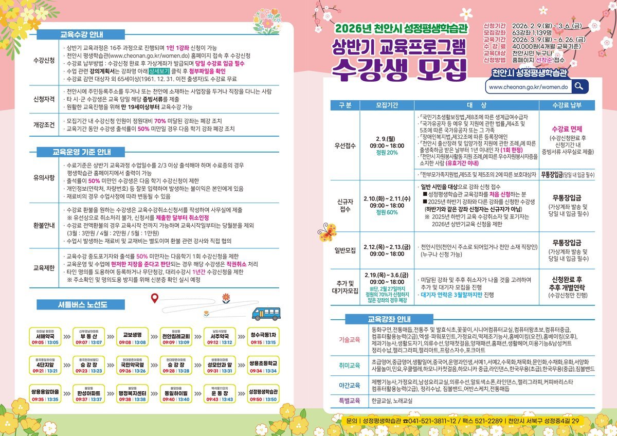 상반기 교육과 관련한 자세한 사항은 천안시 평생학습포털 누리집을 확인하거나 성정평생학습관으로 문의하면 된다.