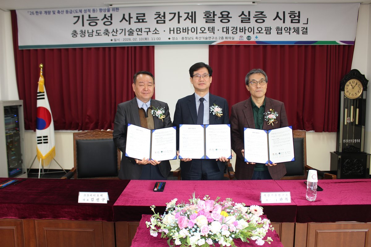 도 축산기술연구소는 지난 10일 연구소에서 이관복 축산기술연구소장과 김선구 HB바이오텍 대표, 김현섭 대경바이오팜 대표가 ‘한우 기능성 사료 첨가제 활용 실증시험 공동연구협약’을 체결했다고 11일 밝혔다.