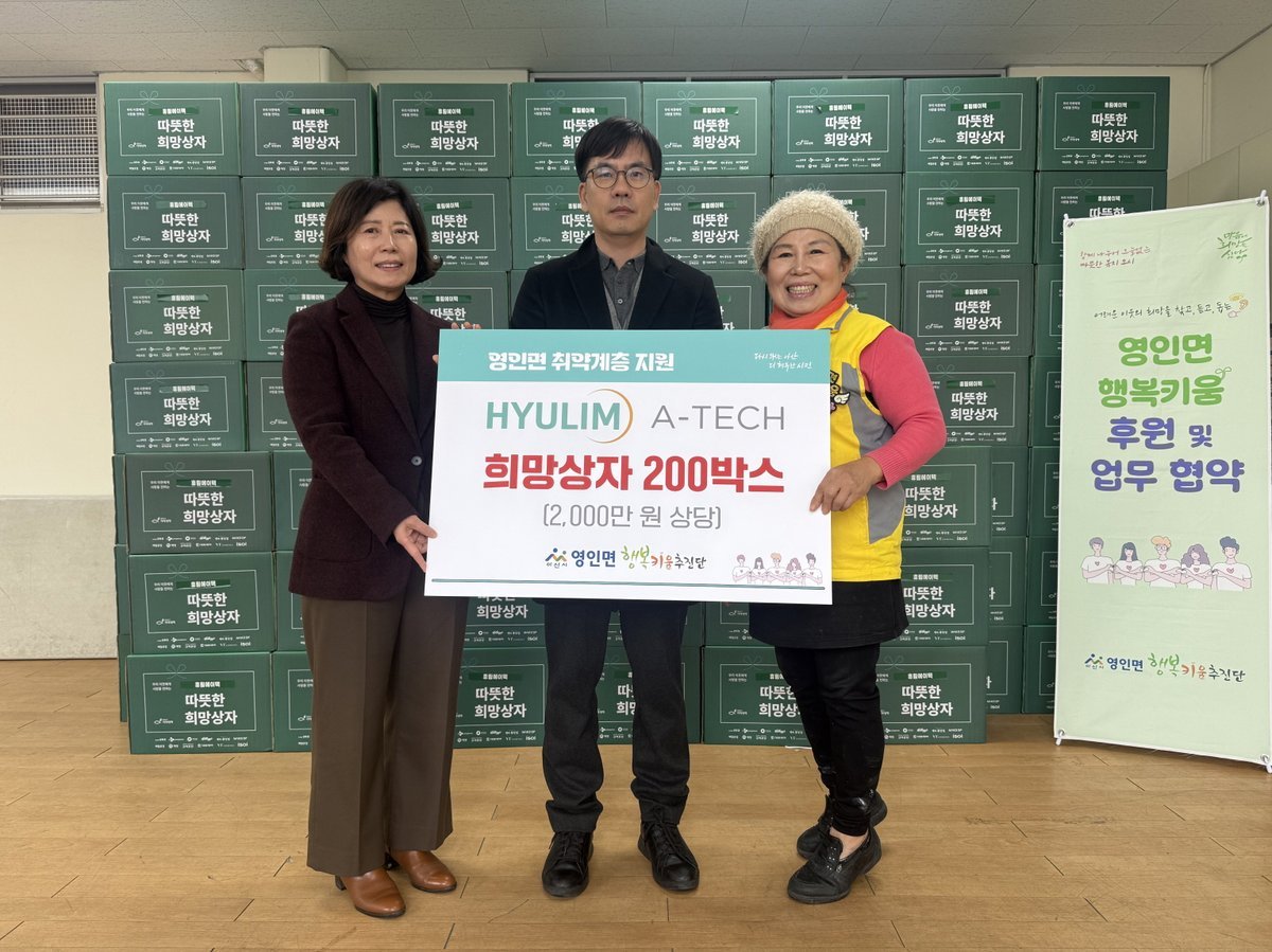 김은경 면장은 "경기 침체로 모두가 힘든 시기에 통 큰 기부를 실천해주신 휴림에이텍 영인공장에 깊이 감사드린다"며 "희망이 구석구석 전달되는 따뜻한 영인면을 만들기 위해 노력하겠다"고 밝혔다.