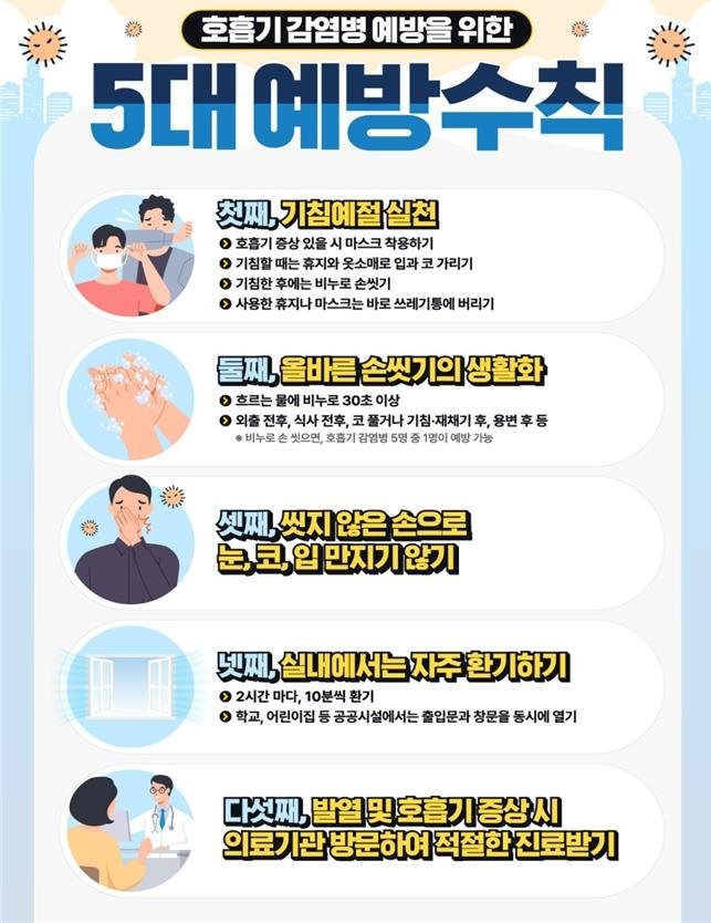 또한, A형 독감에 이어 최근 B형 독감이 유행하고 있어 지속적인 감시와 대응이 필요하며 △환자 접촉 최소화 △마스크 착용 권고 △올바른 손씻기 등 호흡기 감염병 예방수칙이 강조된다.