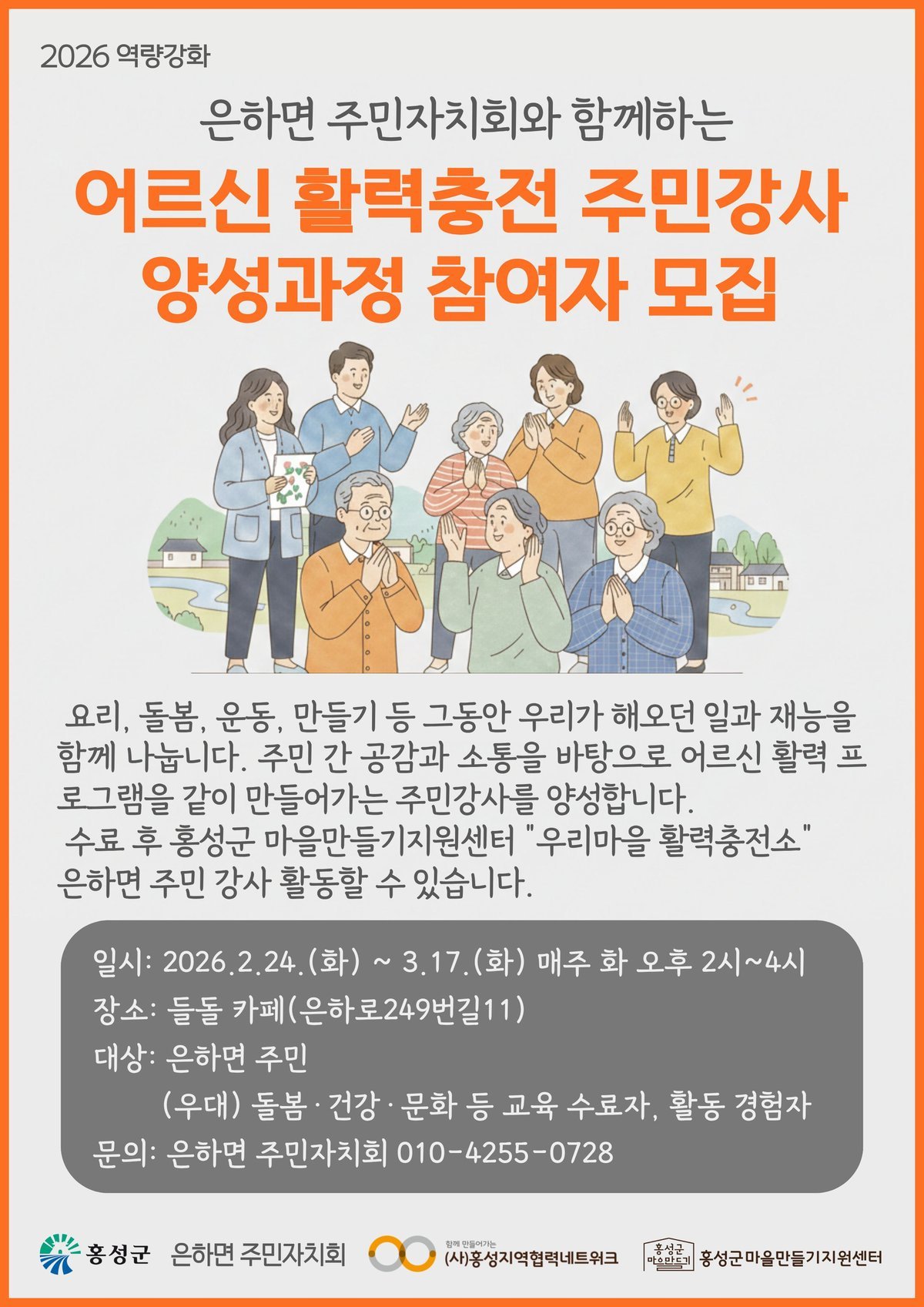 [Ytv영상스토리] 홍성군 은하면 주민자치회는 홍성군 마을만들기 지원센터와 함께 지역 내 어르신 돌봄과 마을 공동체 활성화를 위해 ‘어르신 활력충전 주민강사 양성과정’참여자를 모집한다.