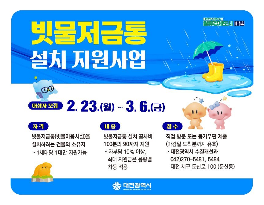 [Ytv영상스토리] 대전시는 기후변화로 인한 가뭄과 물 부족 문제에 선제적으로 대응하고 물 재이용 문화 확산을 위한 ‘2026년 빗물저금통 설치 지원사업’을 추진한다고 밝혔다.