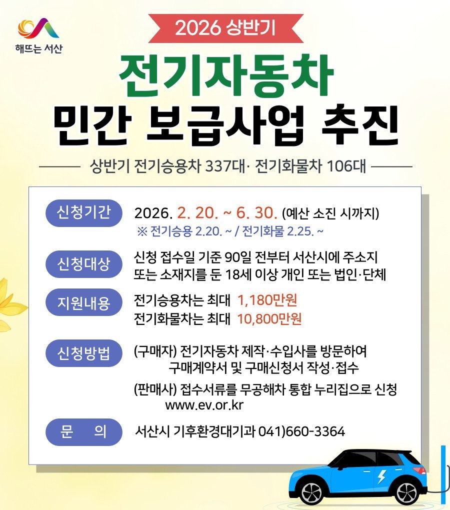 [Ytv영상스토리] 충남 서산시가 대기질 개선을 통한 환경친화적 도시 조성을 위해 ‘2026년 전기자동차 민간보급사업’을 시행한다고 밝혔다.