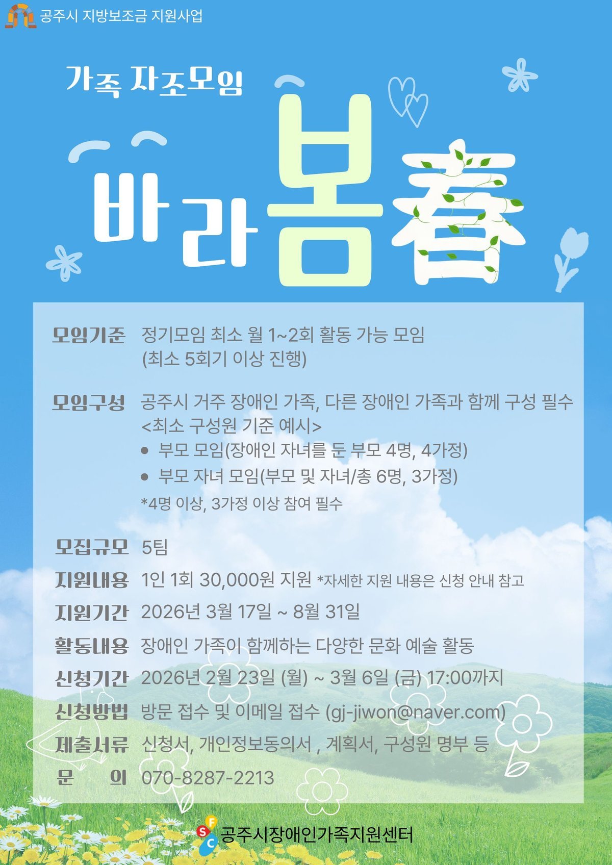 [Ytv영상스토리] 공주시 장애인가족지원센터는 2026년 장애인 가족을 위한 자조모임 프로그램 ‘바라봄’을 운영하고 참여자를 모집한다고 밝혔다.
