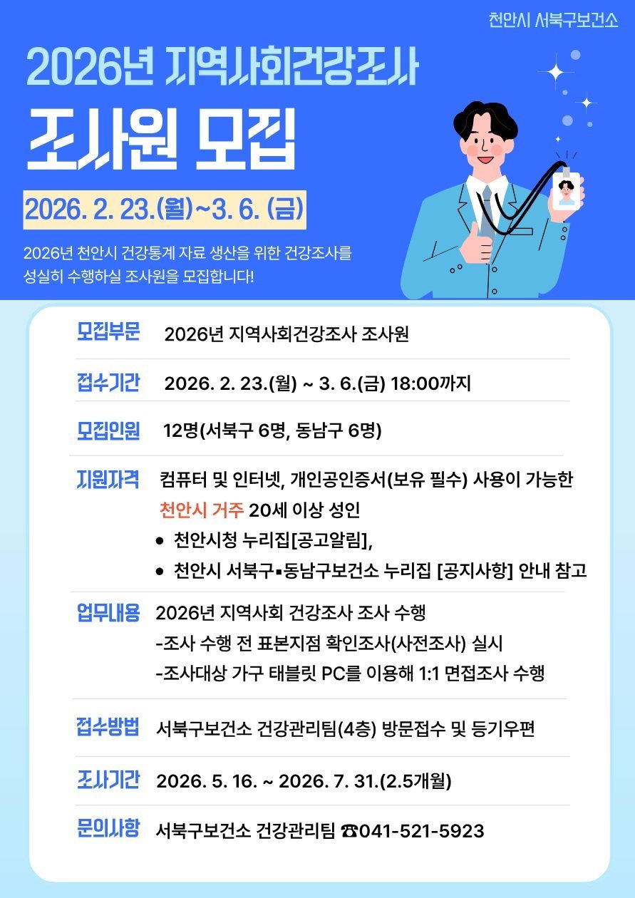 천안시, 2026년 지역사회건강조사 조사원 모집 (천안시 제공)