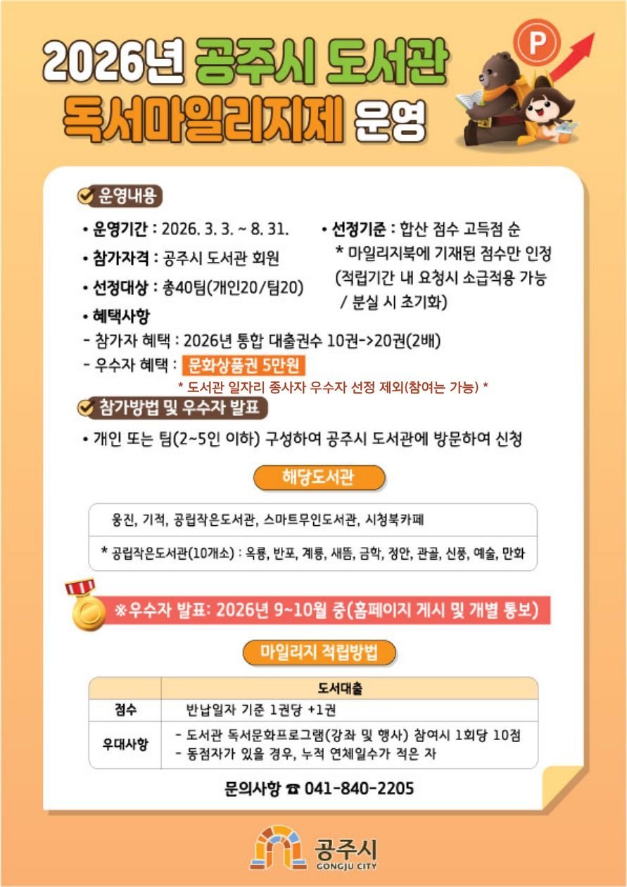 독서마일리지제는 도서관 도서 대출 권수를 점수로 환산해 누적 점수가 높은 이용자를 선정하는 사업으로 공주시 도서관 회원이면 누구나 참여할 수 있다.