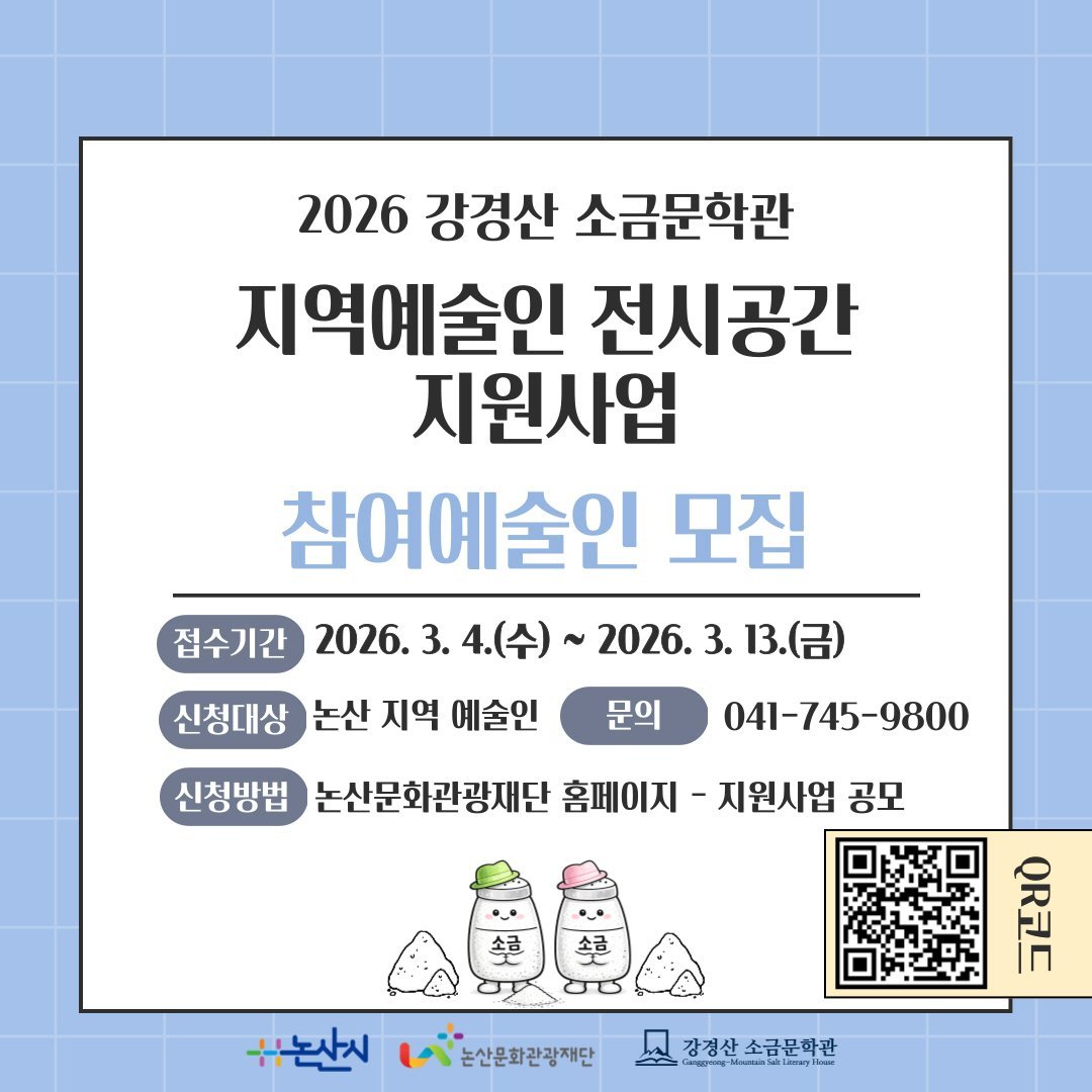 [Ytv영상스토리] 논산문화관광재단은 지역 예술인의 창작 활동을 지원하고 문화예술 기반을 강화하기 위해 강경산소금문학관 '지역예술인 전시공간 지원사업'참여 작가를 3월 4일부터 3월 13일까지 공개 모집한다.