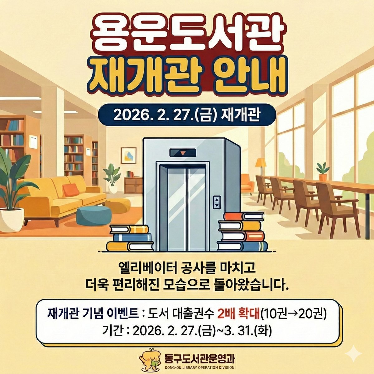 박희조 동구청장은 "102일간의 휴관기간 동안 불편을 감내하며 기다려 주신 주민 여러분께 감사드린다"며 "새롭게 설치된 엘리베이터를 통해 누구나 편리하게 도서관을 이용하며 배움의 즐거움을 누리시길 바란다"고 말했다.