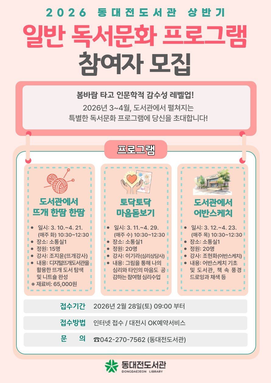 [Ytv영상스토리] 동대전도서관은 새봄을 맞아 3월부터 4월까지 시민들의 문화 향유 기회 확대를 위한 상반기 성인 독서문화 프로그램 을 운영한다.