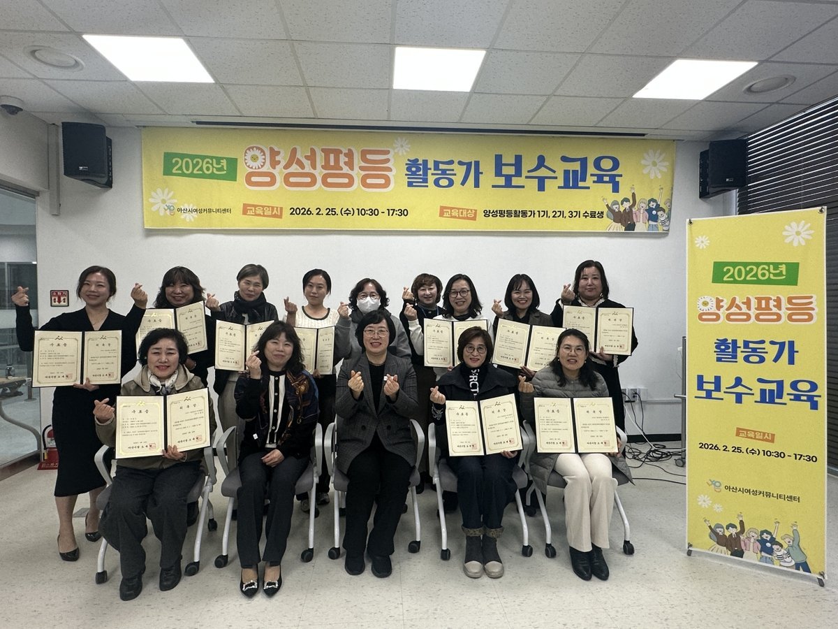 [Ytv영상스토리] 아산시 여성커뮤니티센터 나온 은 지난 25일 센터 교육장에서 아산시 양성평등 리더 활동가 1, 2, 3기 수료생 11명을 대상으로 2026년 아산시 양성평등 리더 활동가 보수교육 을 실시했다.