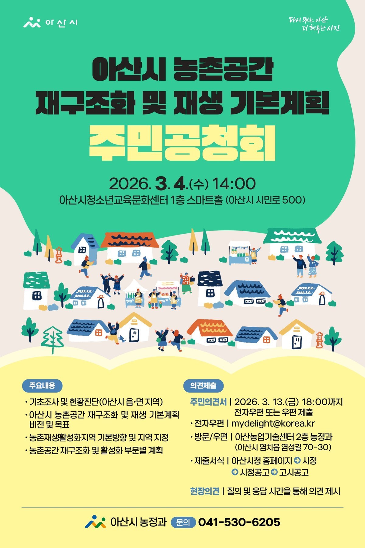 [Ytv영상스토리] 아산시는 농촌공간 재구조화 및 재생 기본계획 수립과 관련해 지역 주민과 관계 전문가의 의견을 수렴하기 위한 주민공청회를 오는 3월 4일 오후 2시, 아산시 청소년교육문화센터 1층 스마트홀에서 개최한다.