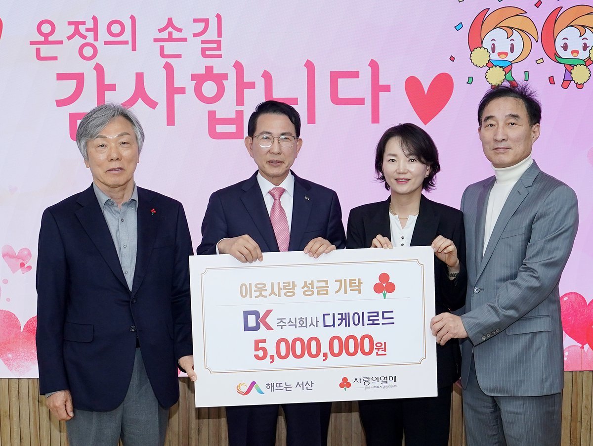시는 이날 시청 시장실에서 이완섭 서산시장, 온은주 디케이로드 대표이사, 성우종 충남사회복지공동모금회 회장 등이 참석한 가운데 기탁식을 개최했다.
