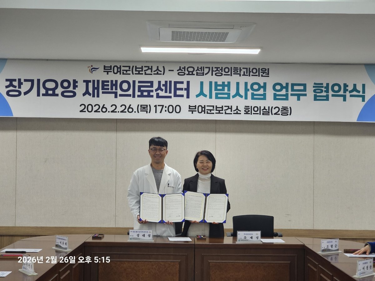 [Ytv영상스토리] 부여군은 거동이 불편한 장기요양 수급자가 재택에서 안정적으로 의료서비스를 받을 수 있도록 지원하는 ‘장기요양 재택의료센터 시범사업’추진을 위해 성요셉가정의학과의원과 업무협약을 체결했다고 3일 밝혔다.