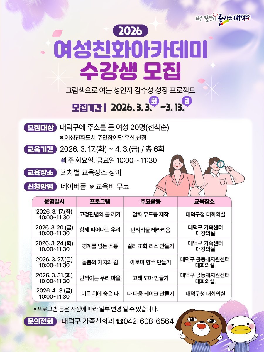 [Ytv영상스토리] 오는 13일까지 수강생 모집 오는 17일부터 선착순 모집 총 6회 진행 그림책 치유 프로그램 통해 성인지 감수성 향상 대전 대덕구는 오는 13일까지 '2026년 여성친화아카데미'수강생을 모집한다.