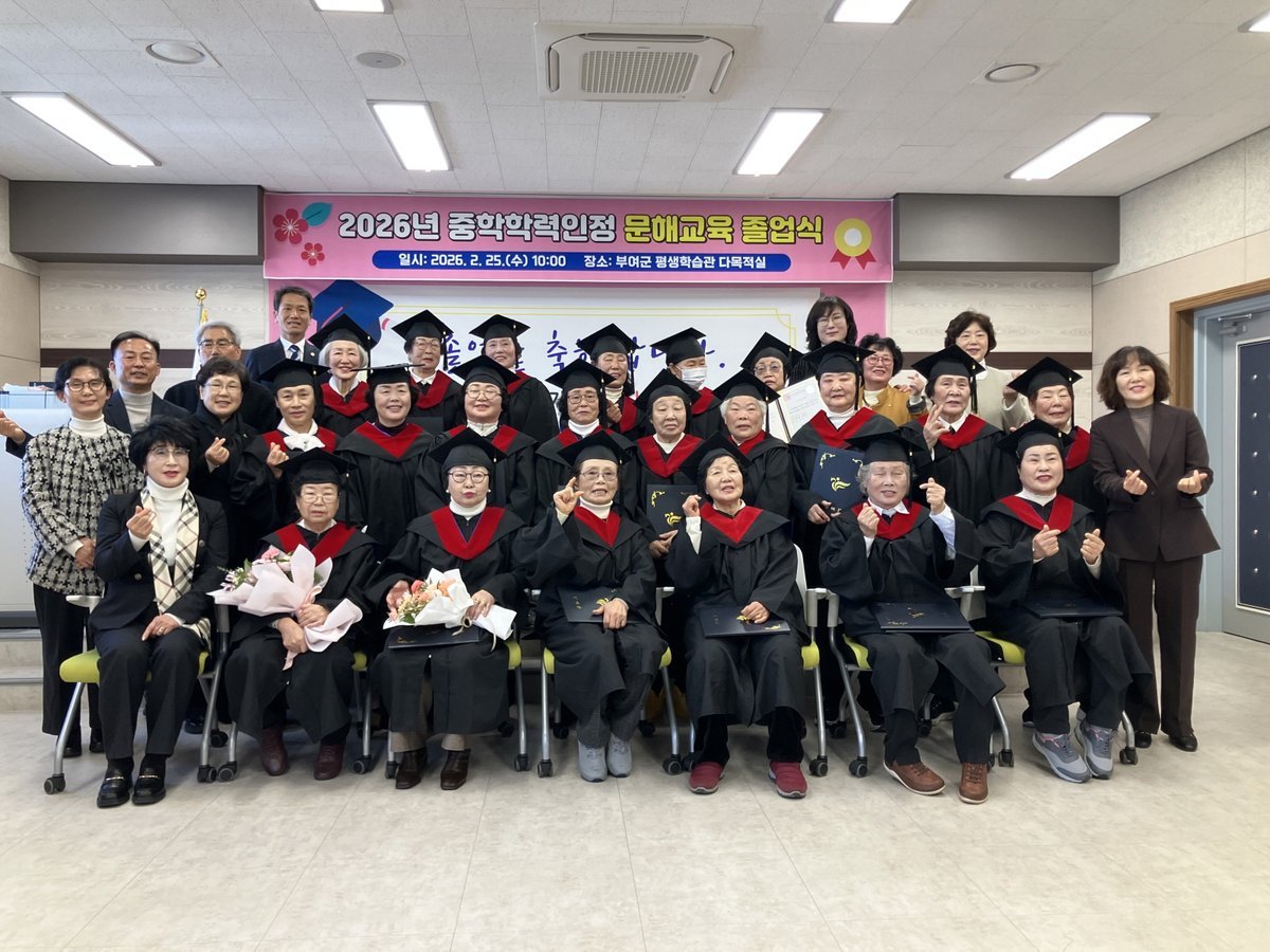 [Ytv영상스토리] 부여군은 부여군 평생학습관 3층 다목적실에서 ‘2026년 중학학력인정 문해교육 졸업식’을 개최하고 배움의 열정으로 가득 찼던 3년간의 과정을 마친 25명의 어르신에게 졸업장을 수여했다고 4일 밝혔다.