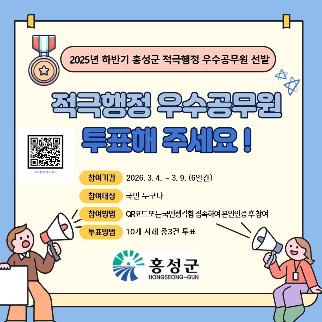 [Ytv영상스토리] 홍성군이 ‘2025년 하반기 적극행정 우수공무원 선발’을 위해 오는 9일까지 국민권익위원회 ‘국민생각함’플랫폼에서 온라인 주민 투표를 진행한다.