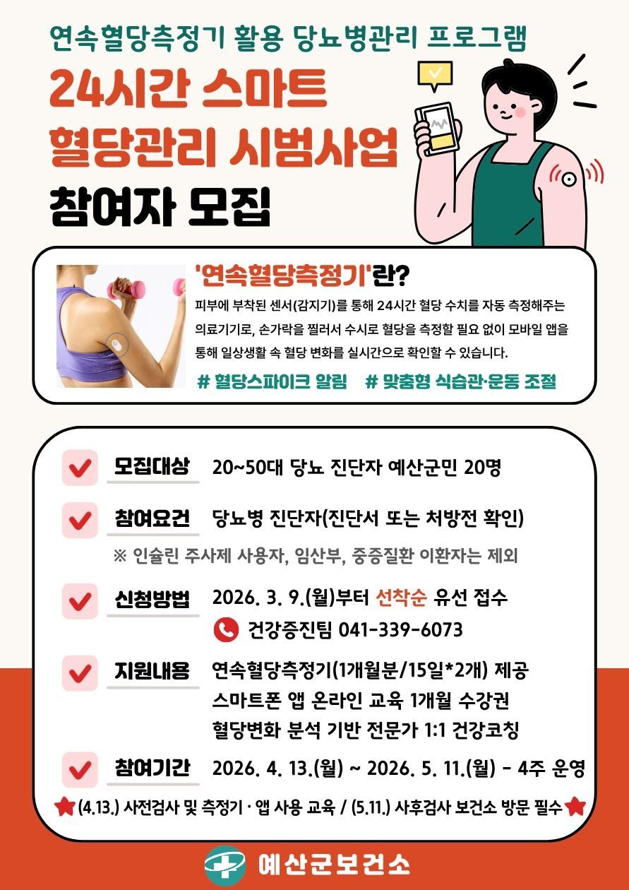 [Ytv영상스토리] 예산군보건소는 오는 3월 9일부터 ‘24시간 스마트 혈당관리 시범사업’참여자 20명을 선착순 모집한다.