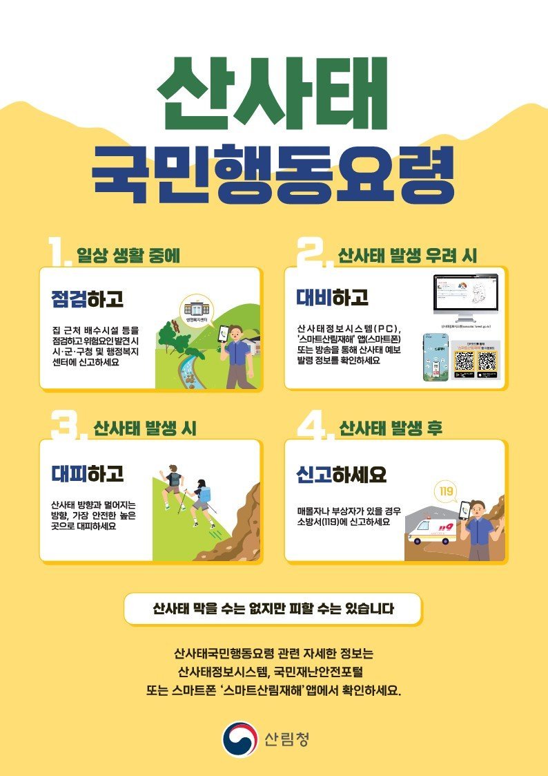 아울러 산사태취약지역 내 거주민과 인근 주민을 대상으로 산사태 국민 행동 요령을 홍보해 비상 상황 발생 시 신속한 대피가 이루어질 수 있도록 할 계획이다.