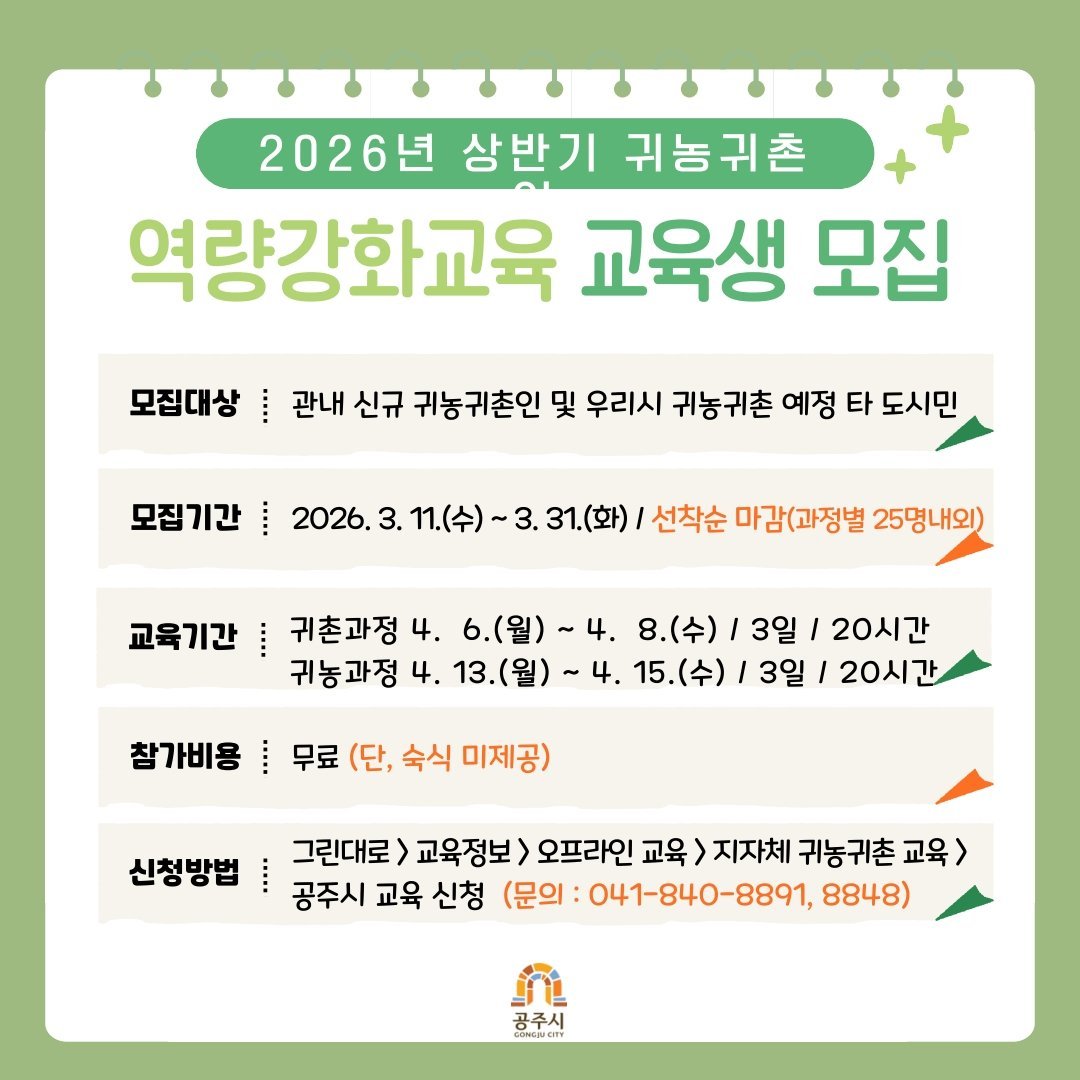 [Ytv영상스토리] 공주시는 2026년 상반기 귀농·귀촌인 역량 강화 교육에 참여할 교육생 50명을 오는 11일부터 모집한다고 밝혔다.