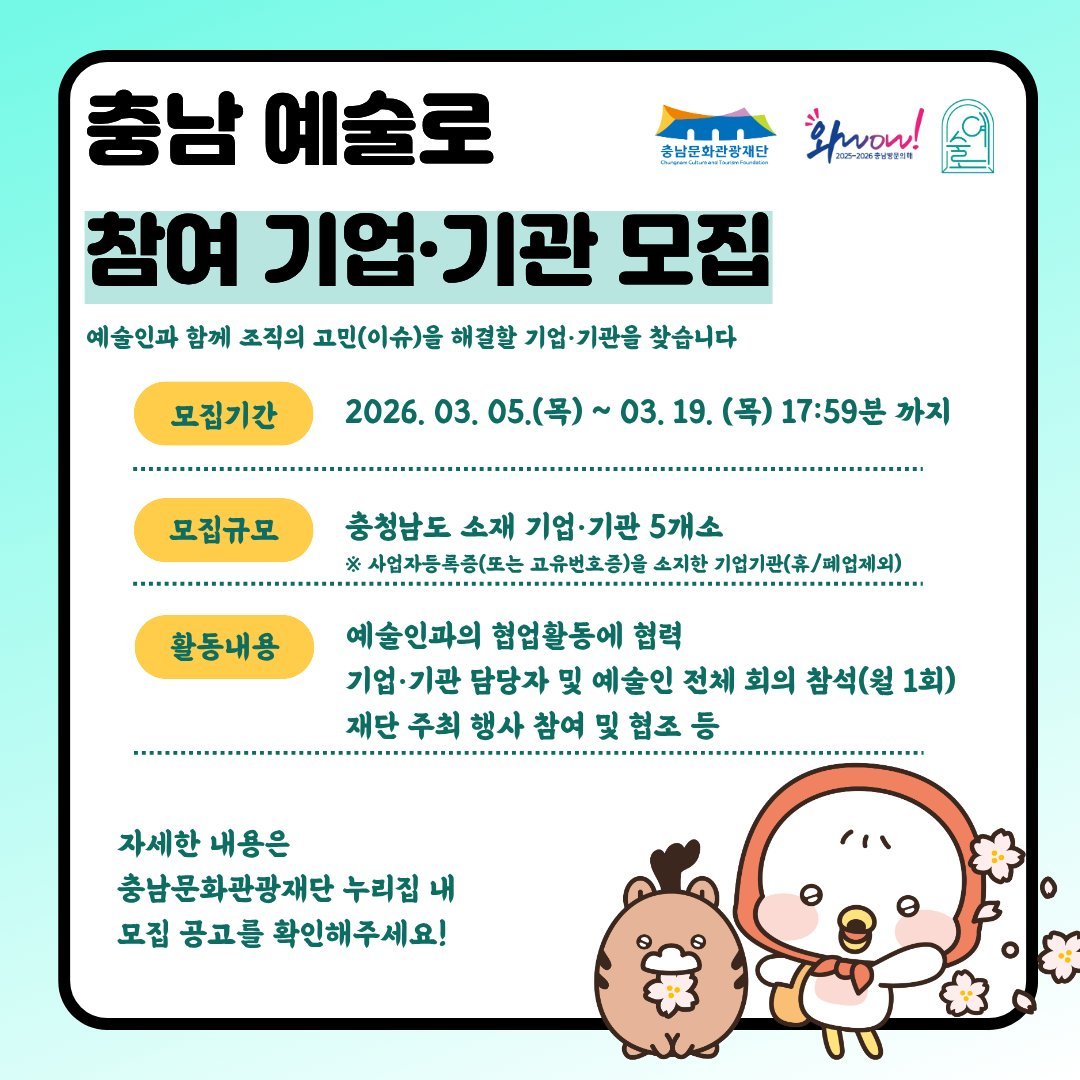 [Ytv영상스토리] 충남문화관광재단이 기업 기관의 당면 과제를 예술적 협업으로 풀어내는 '2026 충남 예술로 지역사업'참여처를 오는 3월 5일부터 19일까지 모집한다.