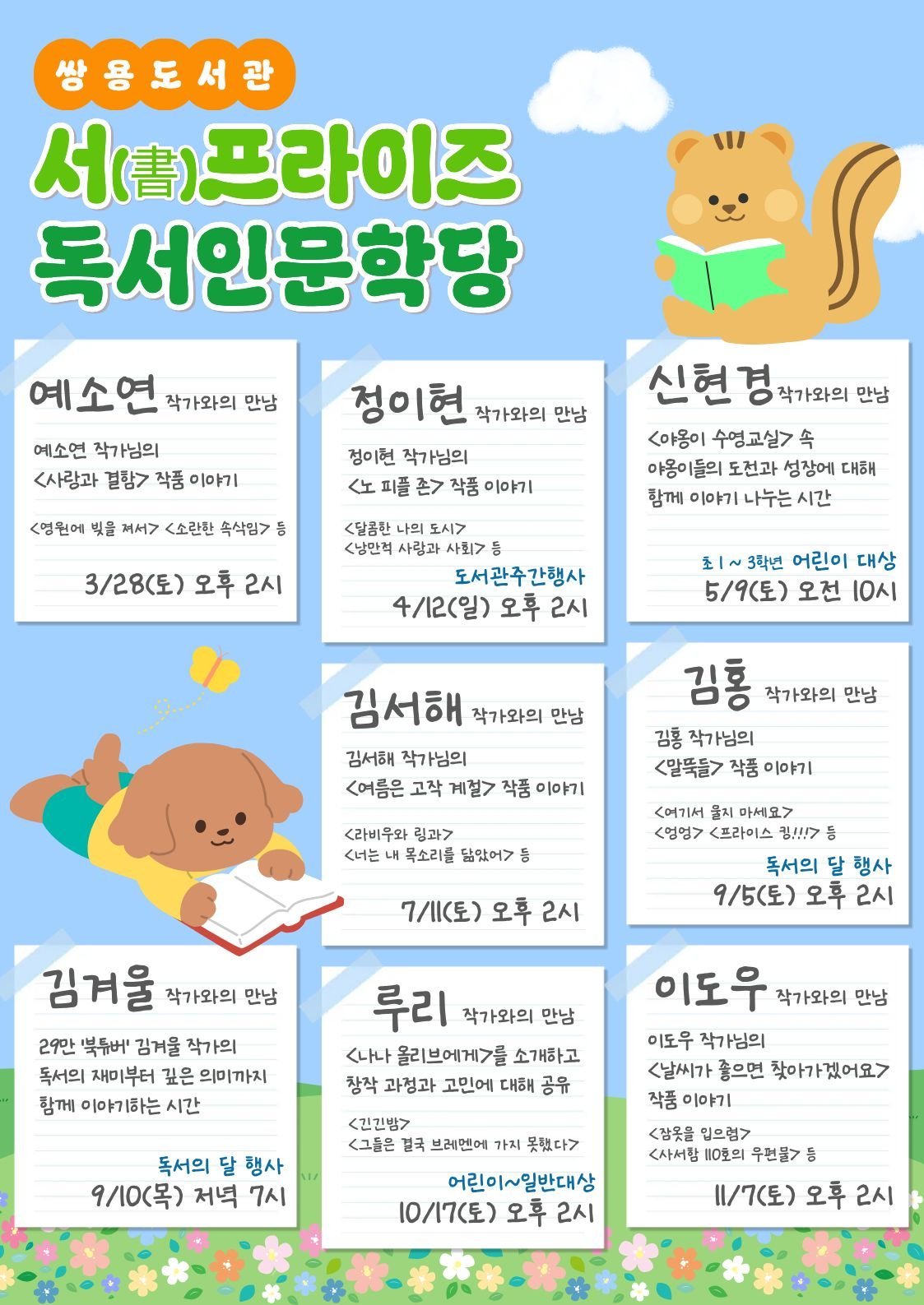 프로그램은 오는 28일 ‘사랑과 결함’예소연 작가를 시작으로 4월, ‘노 피플 존’정이현 작가 5월, ‘야옹이 수영 교실’시리즈 신현경 작가 7월, ‘여름은 고작 계절’김서해 작가 9월, ‘말뚝들’김홍 작가 및 북튜버 김겨울 작가 10월, ‘나나 올리브에게’루리 작가 11월, ‘날씨가 좋으면 찾아가겠어요’이도우 작가와의 만남이 이어질 예정이다.