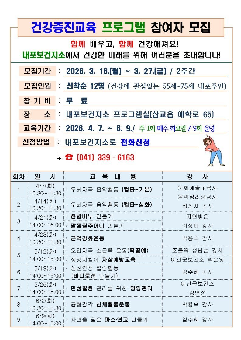 [Ytv영상스토리] 예산군 내포보건지소는 지역 주민의 건강증진과 활기찬 노후생활 지원을 위해 ‘2026년 건강증진교육 프로그램’참여자 12명을 오는 27일까지 선착순 모집한다.
