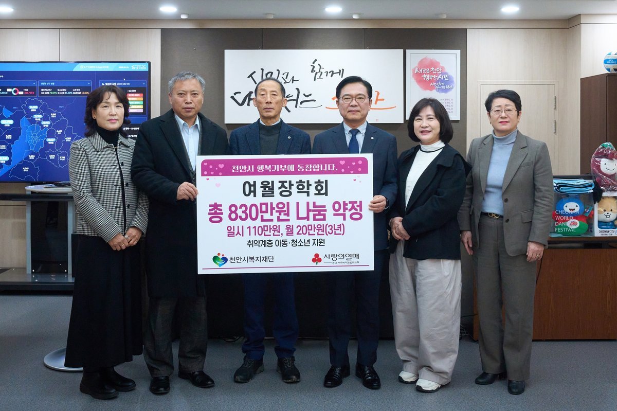 여월장학회는 이날 천안시청 부시장실에서 열린 전달식에서 일시금 110만원과 함께 3년간 매월 20만원의 정기후원을 약정했다.
