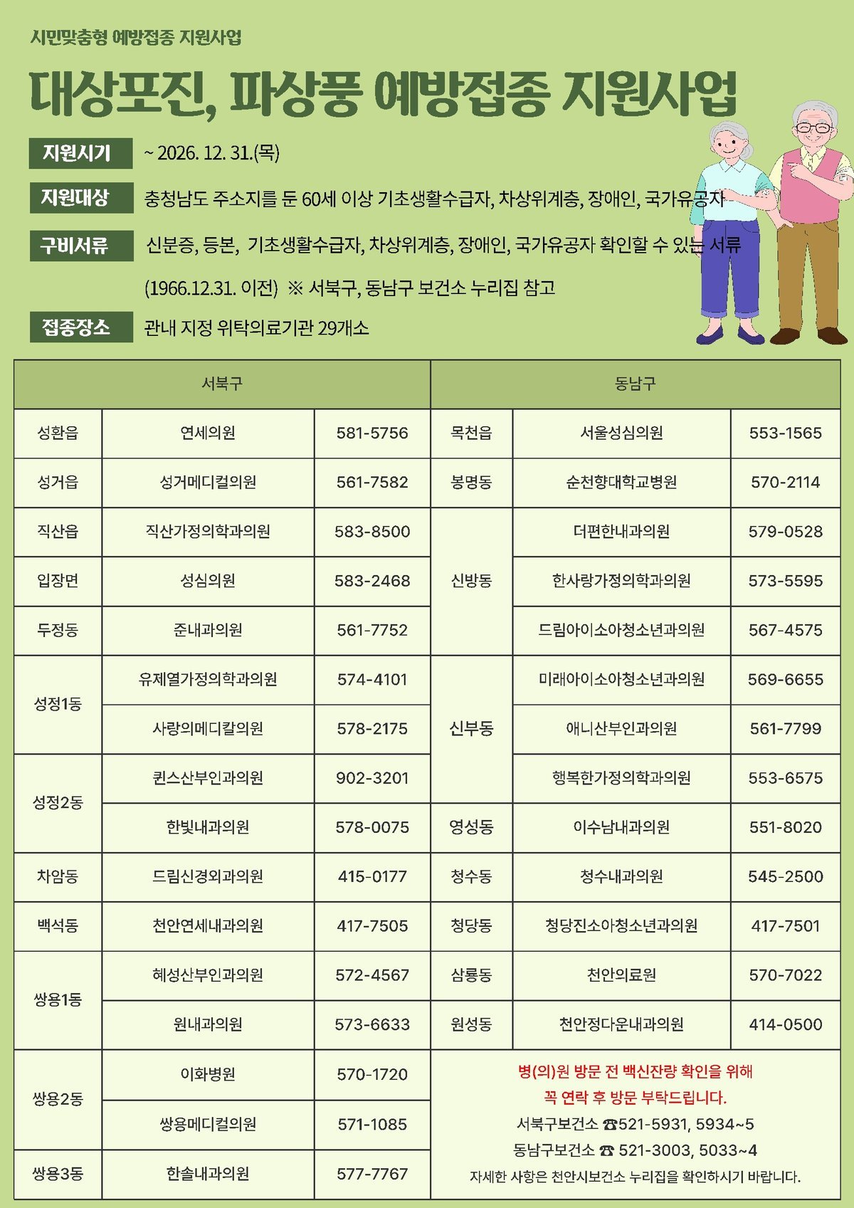 충남도에 주소를 둔 도민이면 다음달 1일부터 천안시 서북구 동남구보건소 및 관내 위탁의료기관에서 무료로 예방접종을 받을 수 있다.