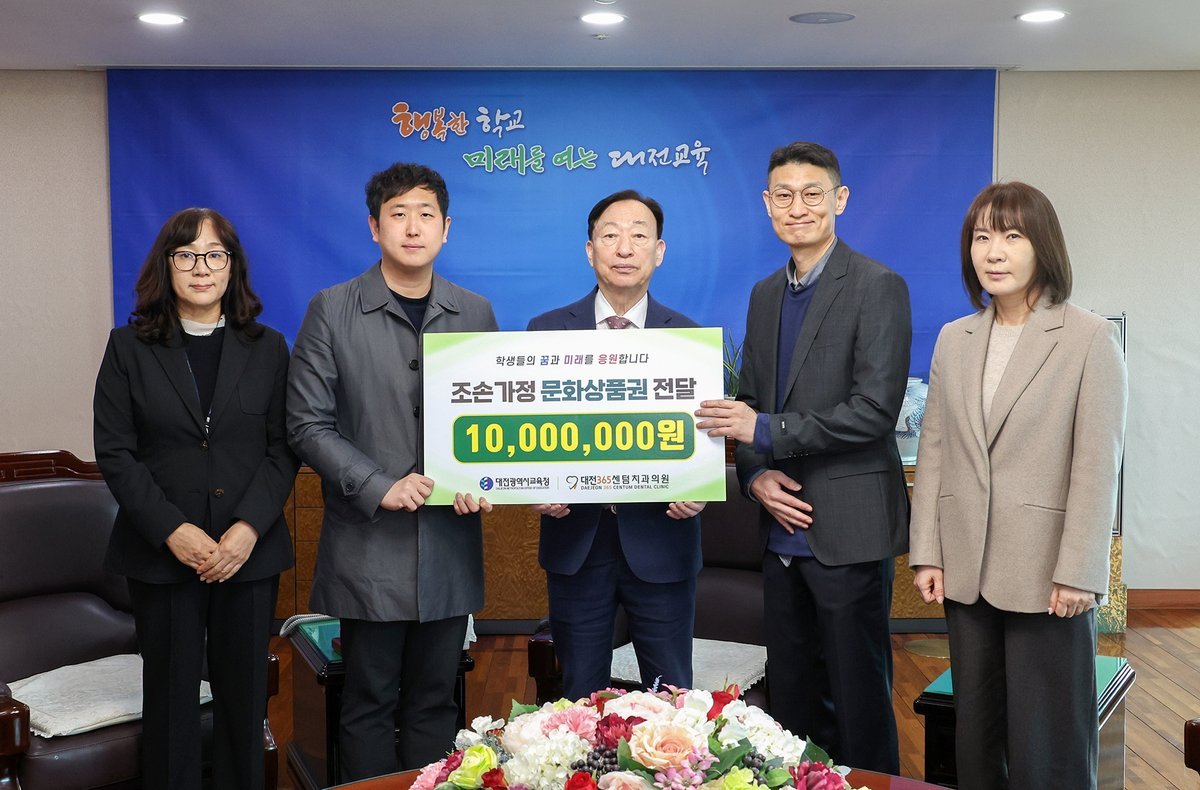 [Ytv영상스토리] 대전시교육청은 3월 12일 대전365센텀치과의원으로부터 조손가정 학생 지원을 위한 문화상품권 1000만원을 기탁받고 기탁식을 개최했다고 밝혔다.