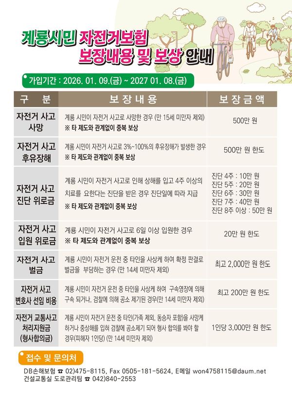 시에 따르면 자전거 보험의 보장 기간은 2027년 1월 8일까지이며 계룡시에 주민등록을 둔 시민이면 별도의 가입 절차 없이 자동으로 보험 혜택을 받을 수 있다.