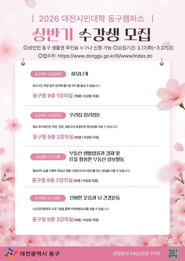 [Ytv영상스토리] 대전 동구는 이달 17일부터 27일까지 '2026 상반기 대전시민대학 동구캠퍼스'수강생을 모집한다고 밝혔다.