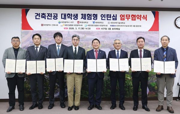 [Ytv영상스토리] 서구는 17일 구청 보라매실에서 목원대학교, 배재대학교, 대전과학기술대학교를 비롯해 대전광역시 건축사회, 대한건설협회 대전광역시회, 대한전문건설협회 대전광역시회, 한국건축구조기술사회 대전 세종 충청지회와 함께 ‘지역 건축 인재 채용 활성화를 위한 건축 전공 대학생 직업 체험형 인턴십 프로그램 업무협약’을 체결했다.