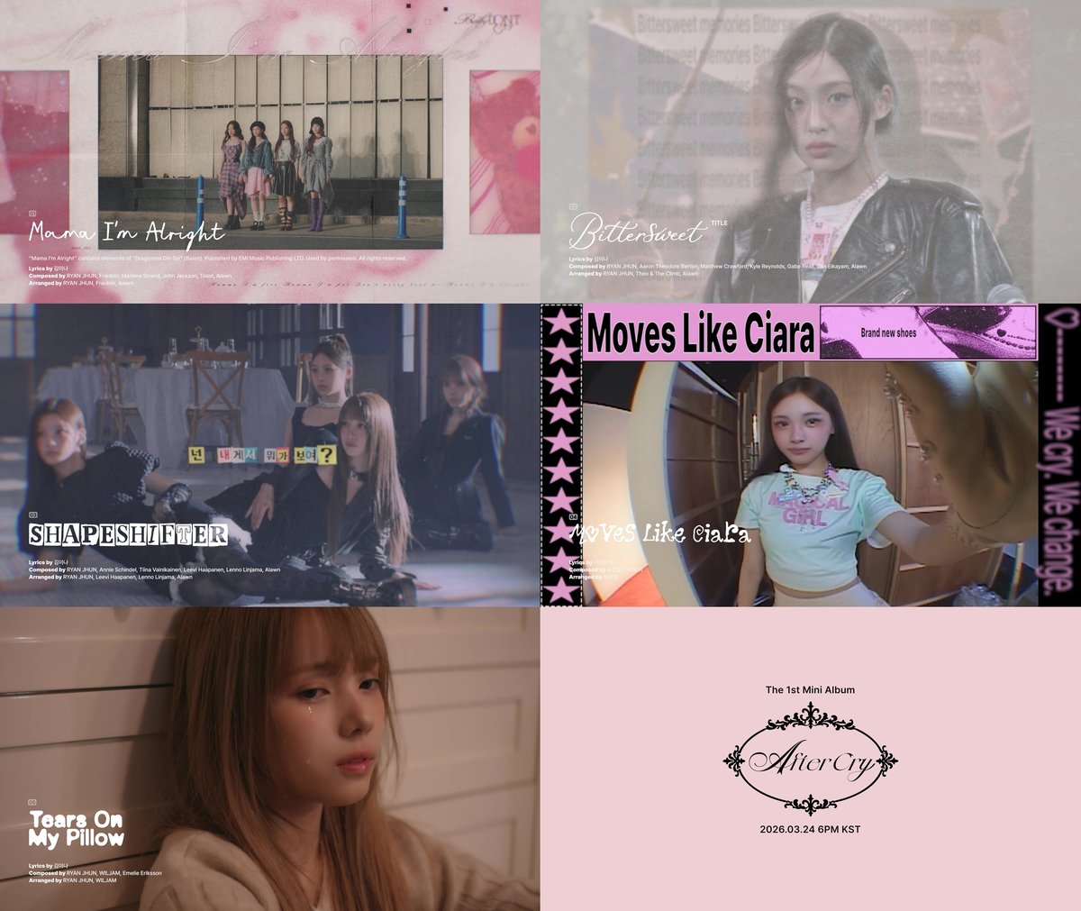 이번 앨범에는 타이틀곡 'Bittersweet'를 비롯해 'Mama, I'm Alright', 컴백에 앞서 11일 발매된 선공개곡 'Shapeshifter', 'Moves Like Ciara', 'Tears On My Pillow'까지 총 다섯 곡이 수록된다. 선공개곡에 이어 김이나 작사가와 라이언 전 프로듀서가 합작한 'Bittersweet'는 밝고 경쾌한 사운드 위로 씁쓸하지만 달콤한 기억을 그려내는 곡이다. 가볍게 스쳐 지나가는 멜로디 사이로 시간이 지난 뒤에야 비로소 마음에 남는 순간들의 감정을 노래했다. 앨범 중 한 곡을 제외한 모든 트랙에 김이나, 라이언 전이 호흡을 맞춰 곡의 완성도에 대한 기대감을 높이고 있다. 또 'Moves Like Ciara'에는 기리보이와 유건형이 크레딧에 이름을 올려 기존 Baby DONT Cry가 선보인 곡들과는 또다른 매력을 어필할 전망이다. 프로모션 캘린더에 따르면 Baby DONT Cry는 16일 앨범 트레일러, 17일 하이라이트 메들리에 이어 18일과 19일 오피셜 포토, 21일부터 23일까지 'Bittersweet'뮤직비디오 티저를 순차적으로 오픈하며 컴백 열기를 고조시킬 예정이다. 발매 당일인 24일에는 컴백 쇼케이스를 개최하고 본격적인 컴백 활동에 돌입한다. 'AFTER CRY'는 눈물 3부작 프로젝트의 포문을 여는 앨범으로 눈물을 흘린 뒤에 시작되는 변화를 그려내며 리스너들에게 깊은 공감을 불러일으킬 전망이다. 이를 통해 더욱 성장 가도를 달릴 Baby DONT Cry의 미래도 기대를 모은다. 한편 Baby DONT Cry의 첫 미니앨범 'AFTER CRY'와 타이틀곡 'Bittersweet'는 24일 오후 6시 각종 온라인 음원 사이트에 공개된다.