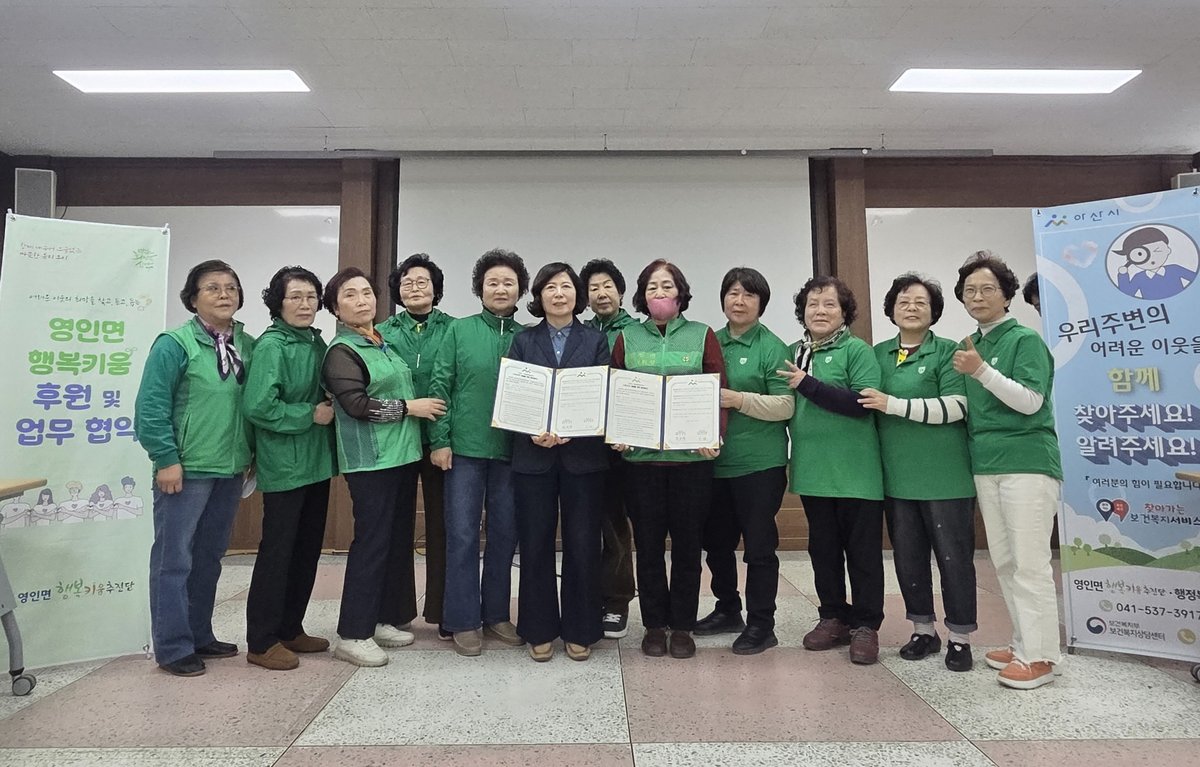 [Ytv영상스토리] 아산시 영인면은 지난 17일 영인면 새마을부녀회와 복지사각지대 해소 및 위기가구 발굴을 위한 업무협약을 체결하고 부녀회원 11명을 명예사회복지공무원으로 위촉한 뒤 역량강화 교육을 실시했다.