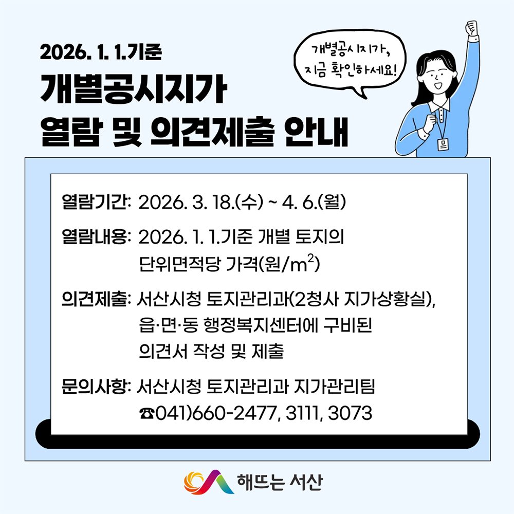 개별공시지가는 3월 18일부터 4월 6일까지 서산시 토지관리과, 읍면동 행정복지센터, 부동산공시가격알리미 누리집에서 열람할 수 있다.