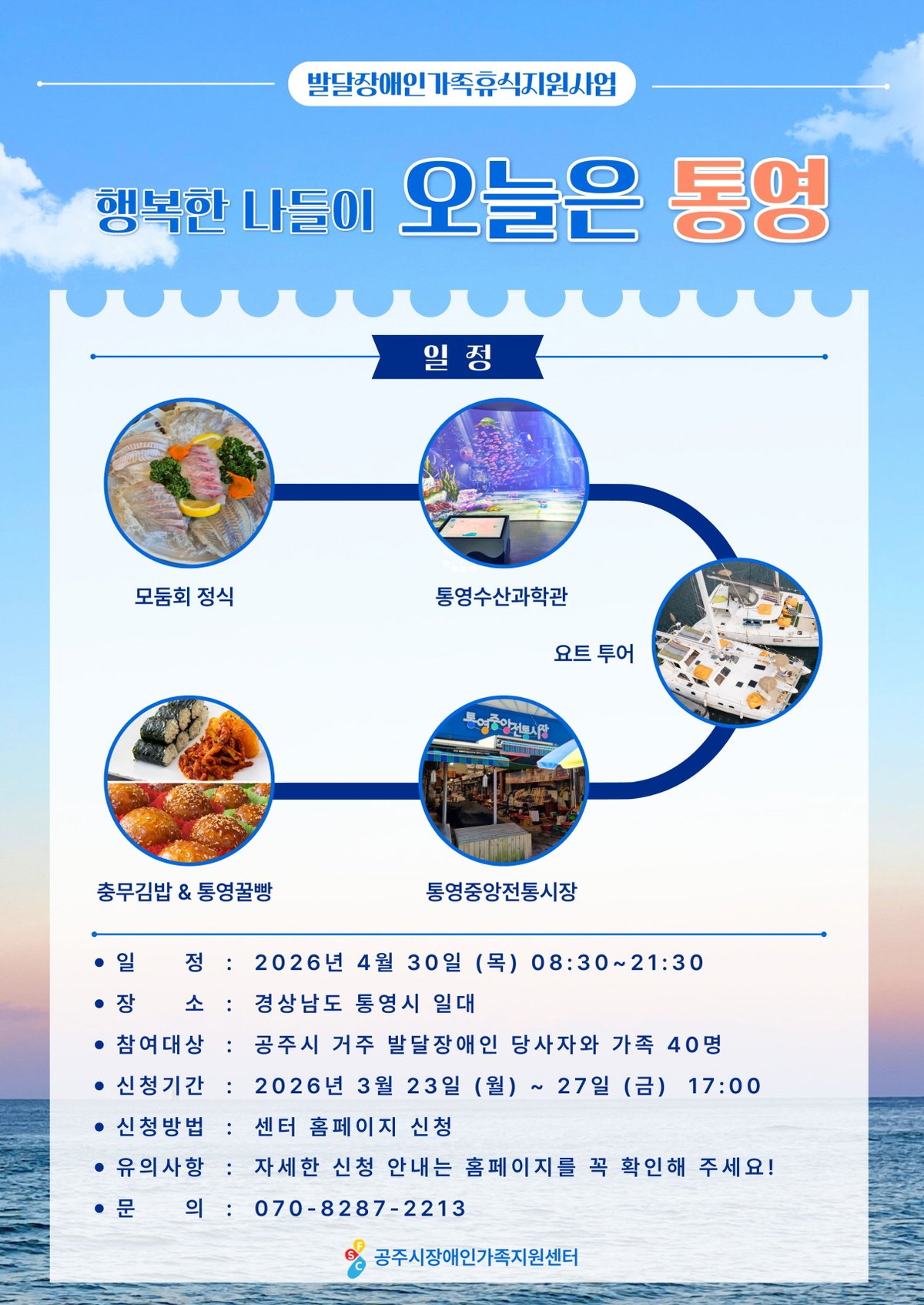 이영식 공주시장애인가족지원센터장은 “이번 프로그램이 일상 속에서 바쁘게 흘러가는 시간을 잠시 내려놓고 가족이 함께 새로운 풍경과 순간을 마주하는 소중한 시간이 되기를 바란다”며 “통영의 바다와 자연을 배경으로 따뜻한 추억을 만들어 가길 기대한다”고 말했다.