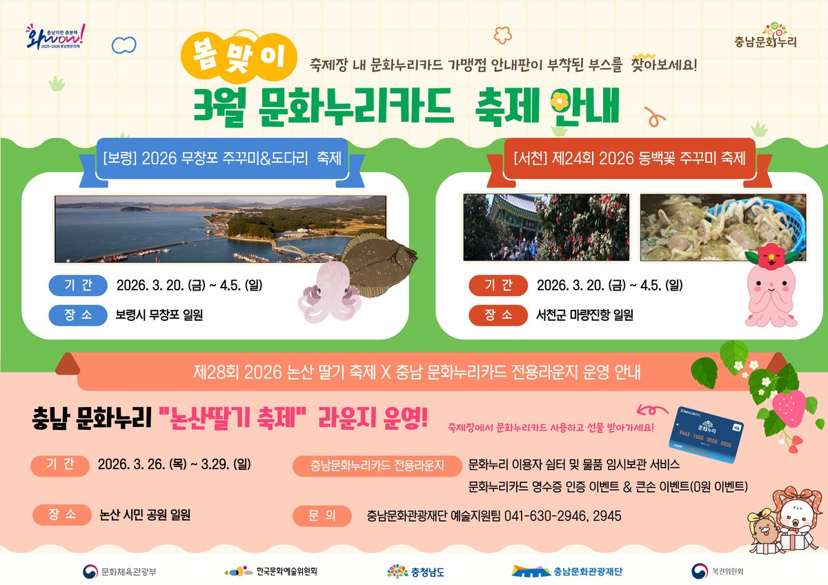 먼저 △2026 무창포 쭈꾸미&도다리 축제와 △제24회 서천 동백꽃 주꾸미 축제 현장에서는 문화누리카드 결제가 가능한 한시 가맹점을 운영한다. 이를 통해 이용자들이 부담 없이 제철 먹거리와 다채로운 체험 프로그램을 경험할 수 있도록 지원할 방침이며, 축제장 내부 문화누리카드 축제 한시 가맹점 안내판이 부착된 부스에서 결제 가능하다.