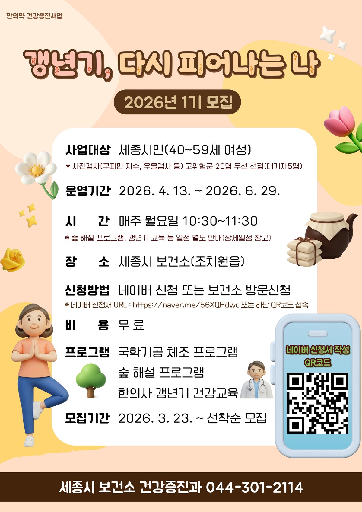 [Ytv영상스토리] 세종시보건소가 오는 23일부터 갱년기 여성의 신체 정신 건강 관리를 위한 한의약 건강증진 프로그램 ‘갱년기, 다시 피어나는 나’ 참가자를 선착순 모집한다.