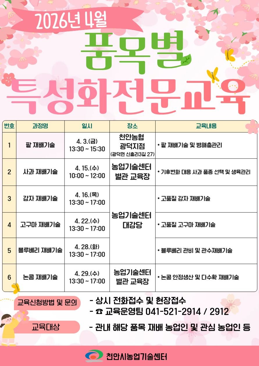 [Ytv영상스토리] 천안시농업기술센터는 다음달 3~ 29일 ‘품목별 특성화 전문교육’을 운영한다고 23일 밝혔다.