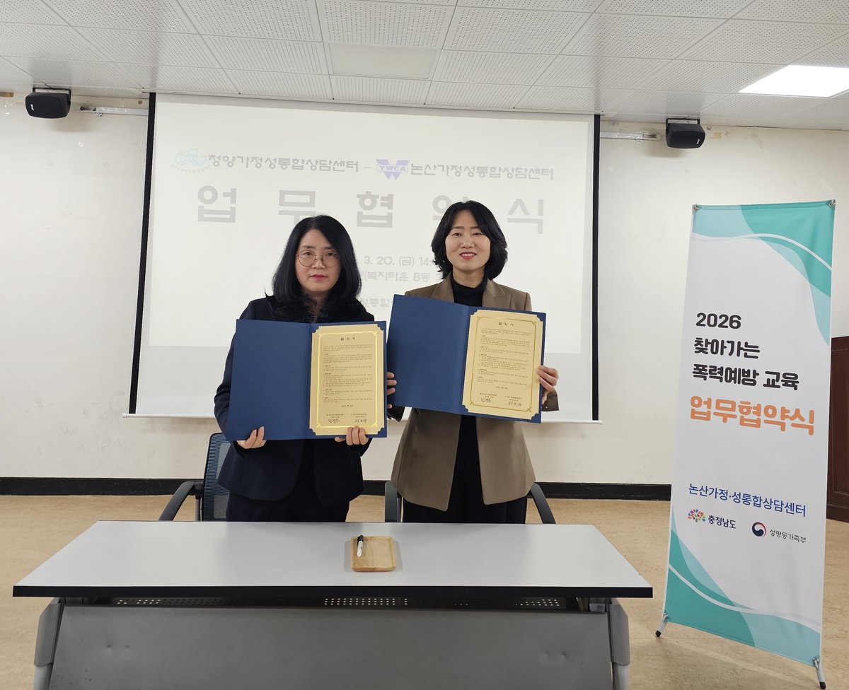 [Ytv영상스토리] 청양가정성통합상담센터는 지역 내 폭력 예방과 안전한 지역사회 조성을 위해 지난 20일 청양복지타운 여성회관에서 논산가정성통합상담센터와 업무협약을 체결했다고 밝혔다.