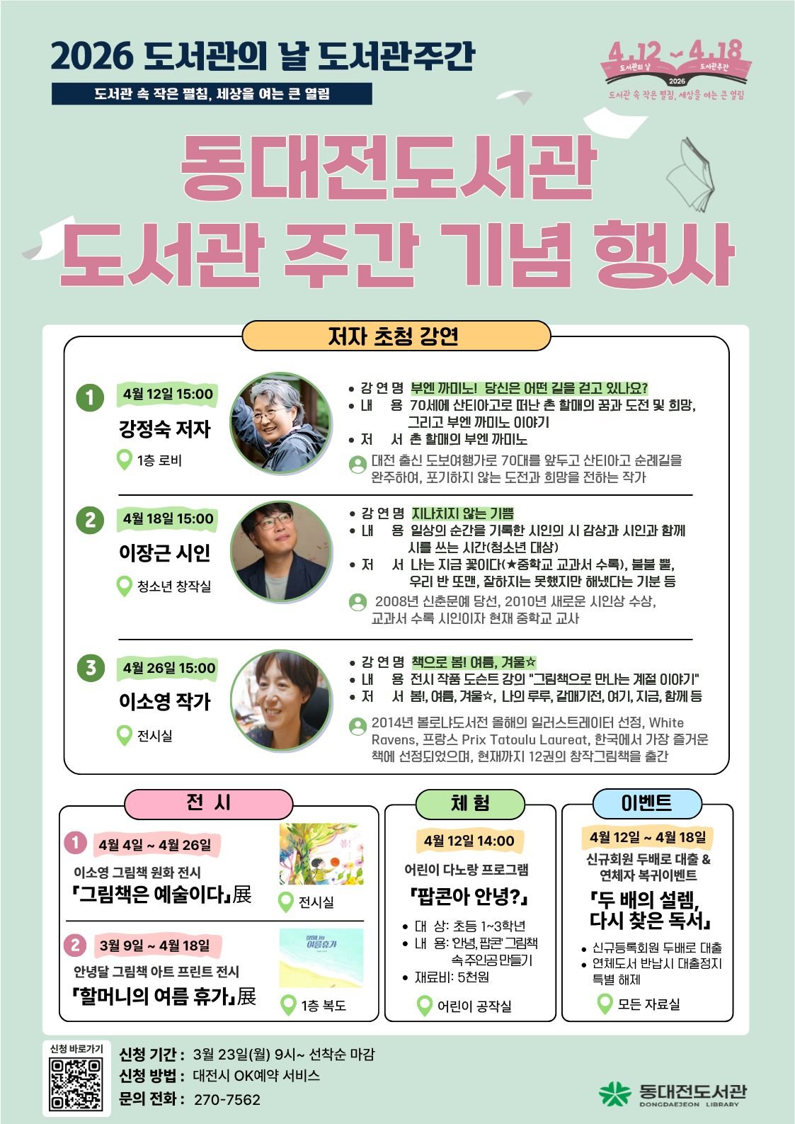 이번 행사는 ‘도서관 속 작은 펼침, 세상을 여는 큰 열림’을 슬로건으로 4월 4일부터 26일까지 동대전도서관 1층 로비와 전시실, 청소년창작실 등에서 진행된다.