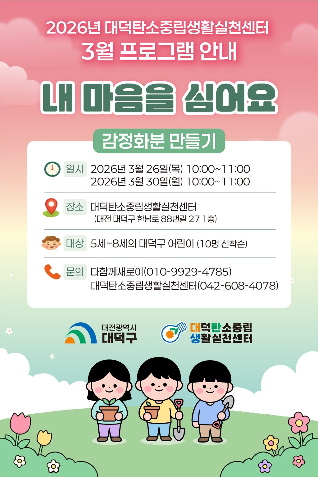 대덕탄소중립생활실천센터는 오는 26일과 30일 '내 마음을 심어요'를 주제로 감정화분 만들기 프로그램을 추진한다고 밝혔다.