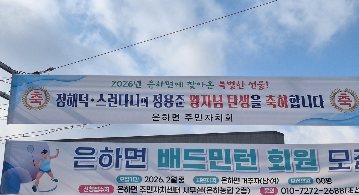 이번 출생은 대천마을에서 17년 만에 들려온 아기 울음소리로 은하면 주민자치회를 비롯한 지역 단체들은 축하 현수막을 게시하며 귀한 생명의 탄생을 한마음으로 반겼다.