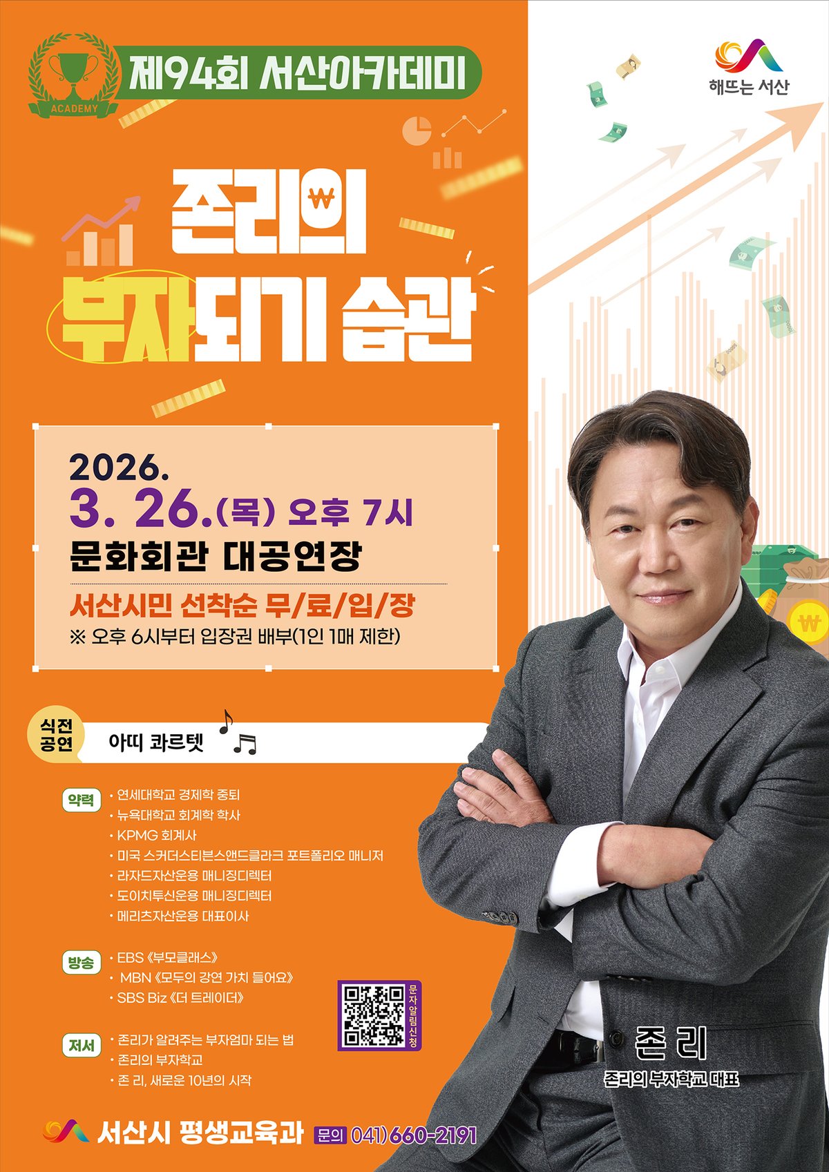 [Ytv영상스토리] 충남 서산시는 ‘존리의 부자학교’존 리 대표를 초청해 제94회 서산아카데미를 개최한다고 밝혔다.