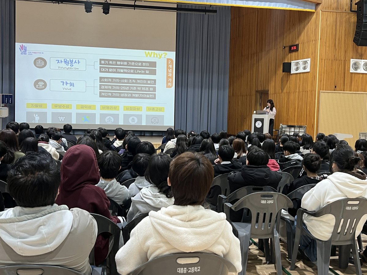 센터는 지난 18일 대흥중학교를 방문해 강당에서 전교생 143명을 대상으로 청소년 자원봉사 순회교육을 실시했다.