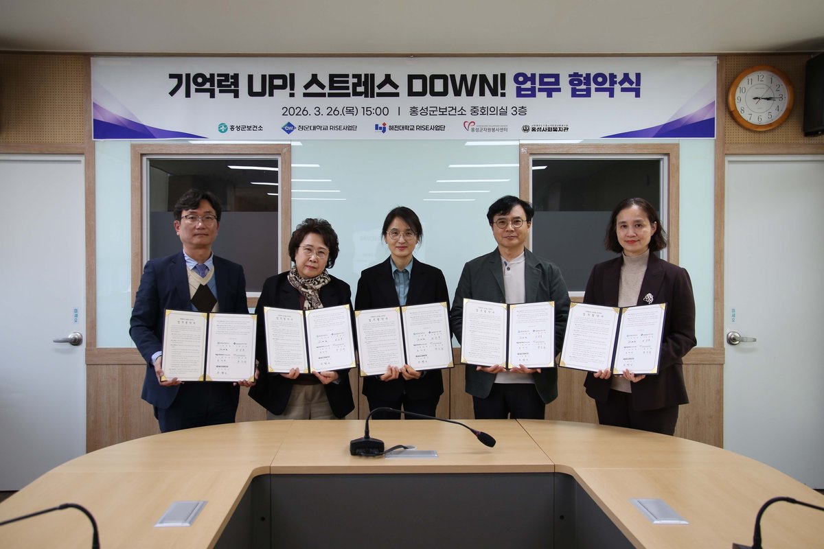 [Ytv영상스토리] 홍성군은 지난 26일 청운대학교 RISE사업단, 혜전대학교 RISE사업단, 홍성사회복지관, 홍성군자원봉사센터와 함께 ‘기억력 UP 스트레스 DOWN’ 사업 추진을 위한 업무협약을 체결했다고 밝혔다.